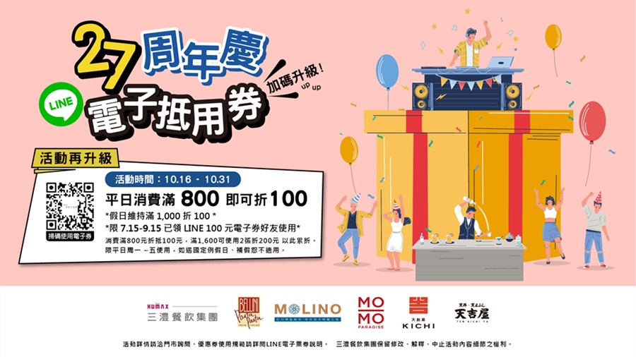 10/16 ~ 10/31平日(一~五) LINE電子券800折100