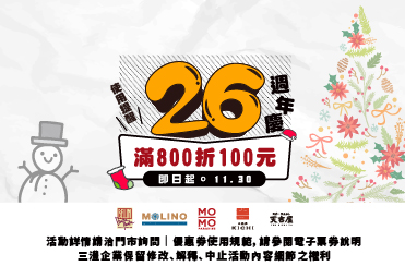 7/18-9/15 滿千送百電子優惠券即將到期! 三澧26週年慶電子優惠兌換自11/15起,消費滿$800折$100。