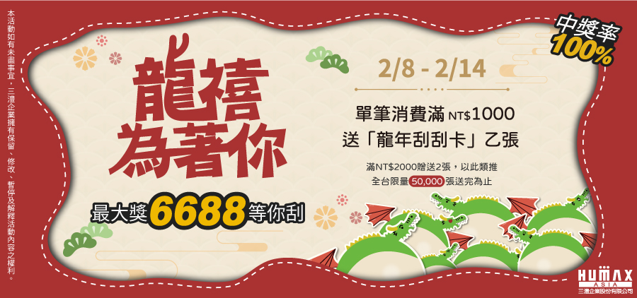 新春試手氣,限量發送開運好禮! 活動期間2/8-2/14,凡至三澧旗下品牌餐廳用餐消費,消費滿額即贈「龍年刮刮卡」,中獎率100%,最大獎$6688等你刮