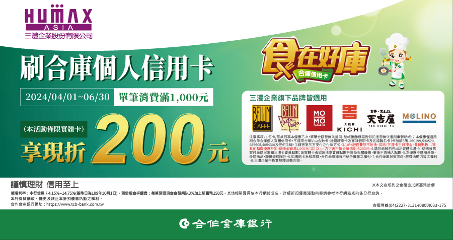 來三澧用餐刷合庫滿千折抵200元