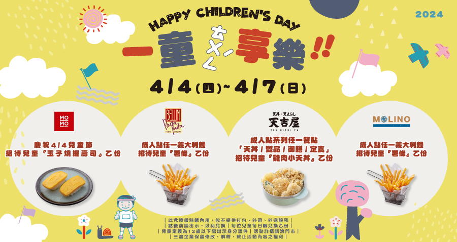 慶祝兒童節,親子用餐限定回饋! 活動期間,帶小朋友至三澧企業旗下四品牌用餐,享受美食,12歲以下兒童餐點免費招待。